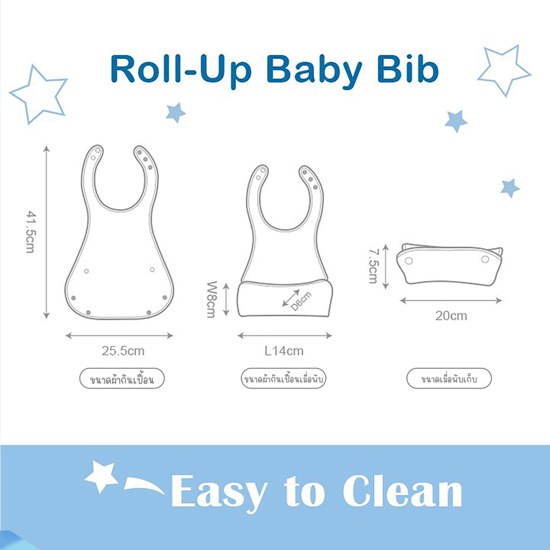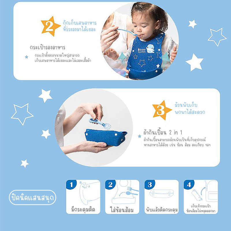 รายละเอียดสินค้า: สวมใส่ตอนรับประทานอาหาร สามารถปรับระดับได้ พับเป็นกระเป๋าเก็บช้อนได้พกพาง่าย ปราศจากสาร BPA และได้รับการรับรองจาก SGS