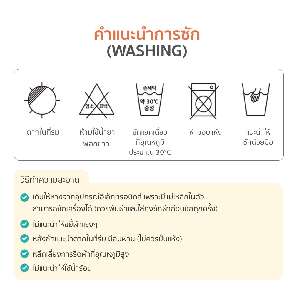 สามารถซักเครื่องได้ (ควรพับผ้าและใส่ถุงซักผ้าก่อนซักทุกครั้ง)